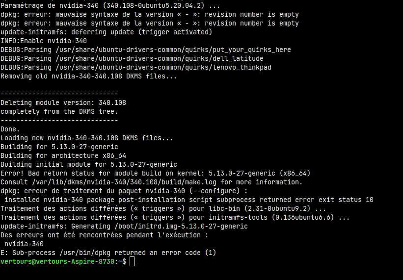 comme dans l'aprem j'avais fait la fameuse commande demandé ''dpkg --configuration -a'', et que j'ai éteins et redémarrer le PC entre temps, j'ai voulu switcher sur le pilote proprio. Ça patine dans la semoule puis nouveau message d'erreur :