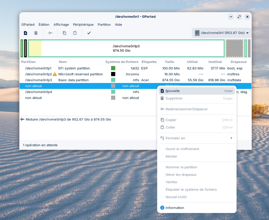 Important : Pour éviter des problèmes, redimensionnez toujours les partitions en partant de la droite pour ne pas modifier le point de montage — d'où la case "Espace libre suivant".