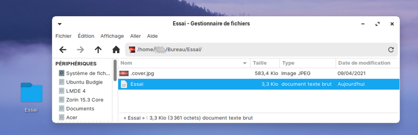 J'ai mis le dossier "Essai" dans le répertoire "Documents" et l'image est bien l'image cachée ".cover.jpg" qu'il contient.