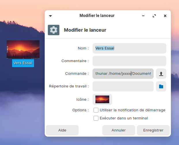 - Crée un lanceur (Clic droit sur le bureau > Créer un lanceur).